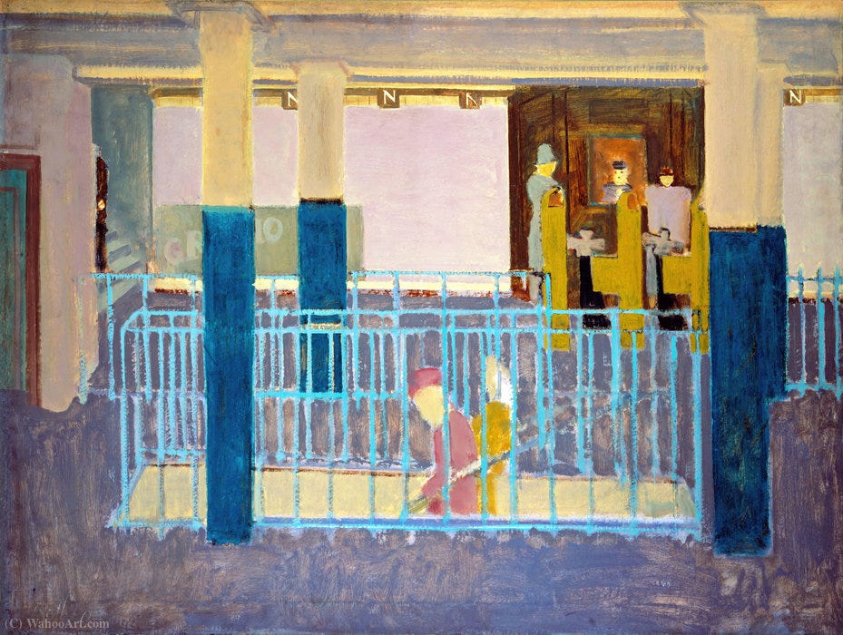 Later, I would learn that Rothko had not always painted this way. His early realist works, the subway scenes, the solitary figures hunched beneath harsh lights, already carried a quiet desolation. In paintings such as Subway Scene or Entrance to Subway, the human form is present, but diminished, pressed inward by architecture and anonymity. These are not portraits of modern life so much as meditations on isolation. Even then, Rothko was less interested in what people were doing than in what they were enduring.